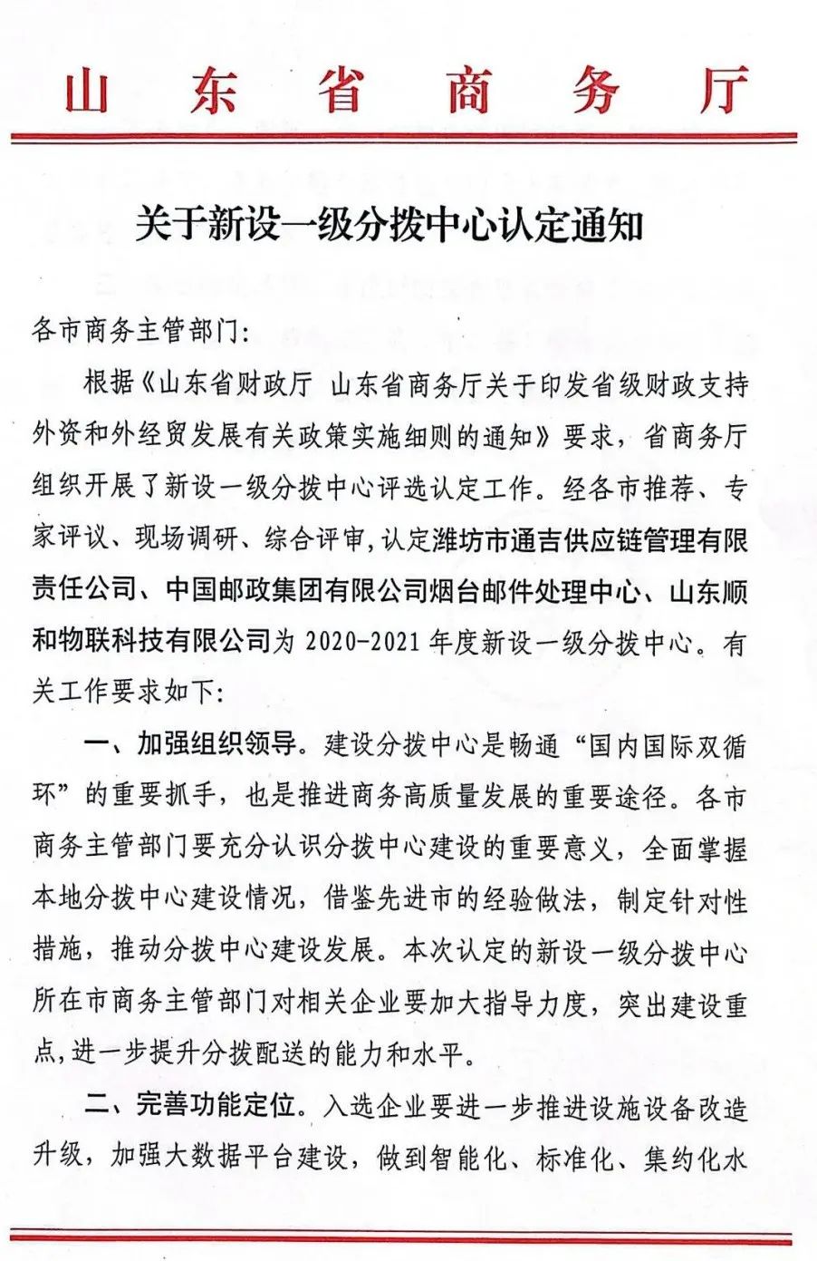 熱烈慶祝山東順和物聯(lián)科技有限公司被山東省商務(wù)廳評(píng)選為“2020-2021年度新設(shè)一級(jí)分撥中心”。
