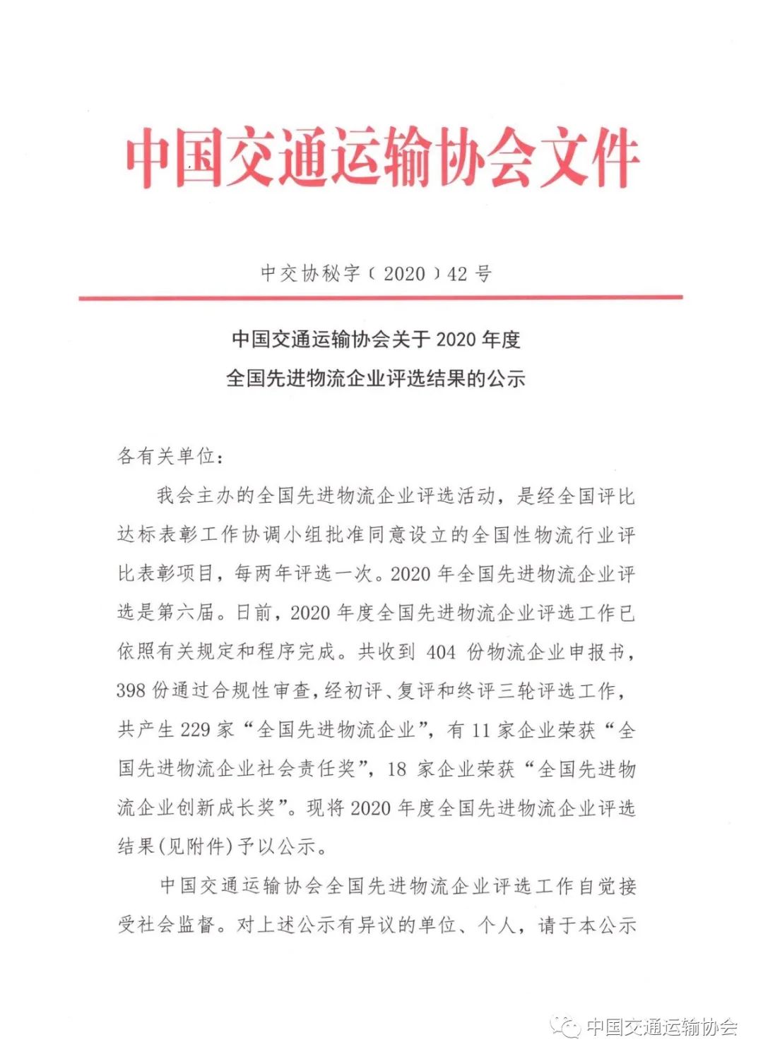 近日,由中國交通運(yùn)輸協(xié)會主辦的全國先進(jìn)物流企業(yè)活動評選結(jié)果公布,通過嚴(yán)格評選,臨沂天源國際物流有限公司被評為“2020年度全國先進(jìn)物流企業(yè)”。