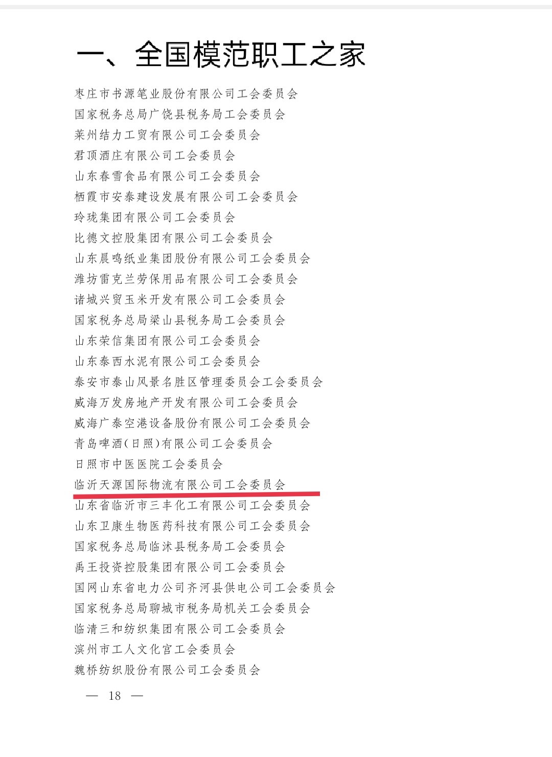 2020年12月31日,臨沂天源國際物流有限公司工會(huì)委員會(huì)被全國總工會(huì)授予“全國模范職工之家”榮譽(yù)稱號。建設(shè)深受職工信賴的職工之家,當(dāng)好職工信賴的娘家人,是工會(huì)工作的永恒課題。天源工會(huì)委員會(huì)將繼續(xù)發(fā)揮示范帶頭作用,牢記黨的全心全意依靠工人階級的方針,堅(jiān)定不移走中國特色社會(huì)主義工會(huì)發(fā)展道路, 強(qiáng)基層、補(bǔ)短板、增活力,切實(shí)維護(hù)職工合法權(quán)益、竭誠服務(wù)職工群眾,努力構(gòu)建和諧勞動(dòng)關(guān)系。