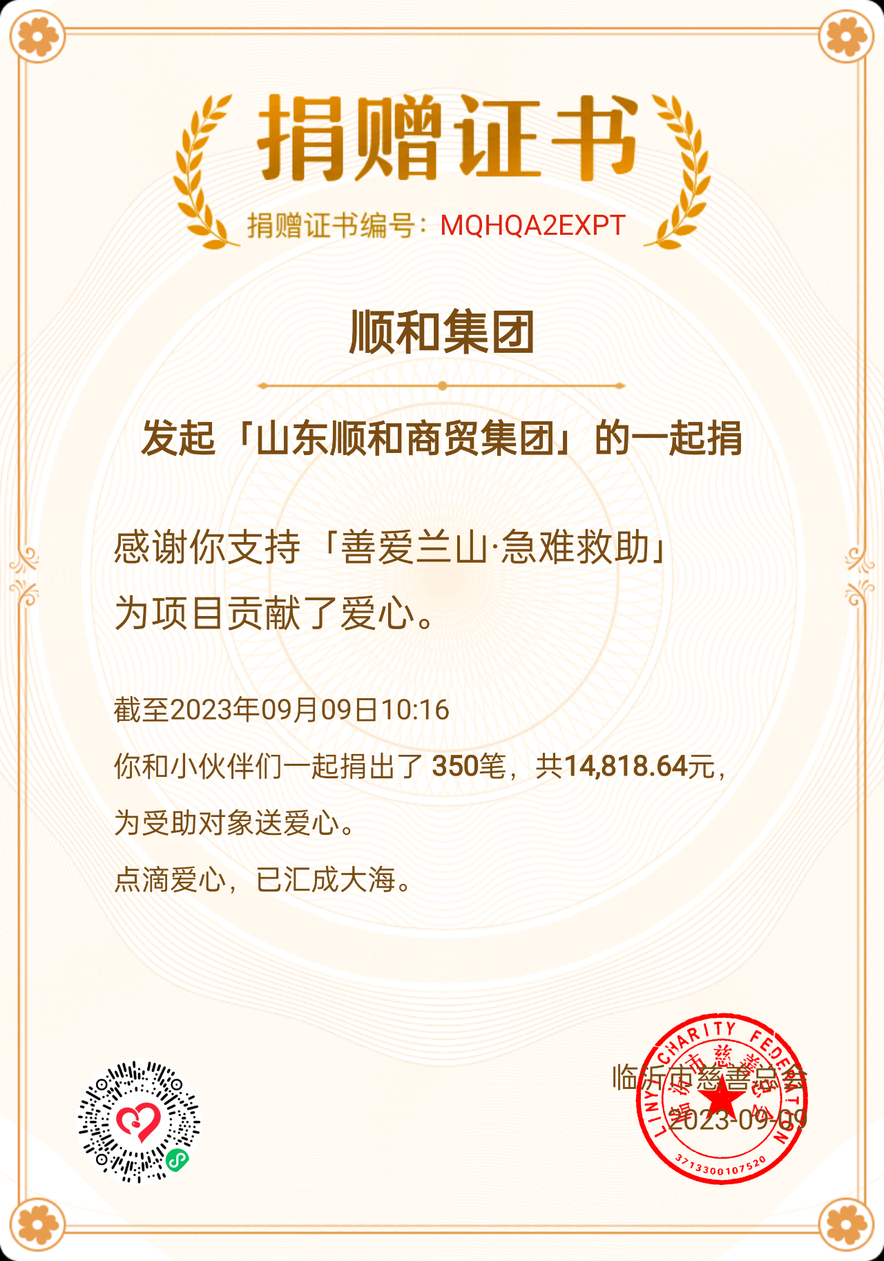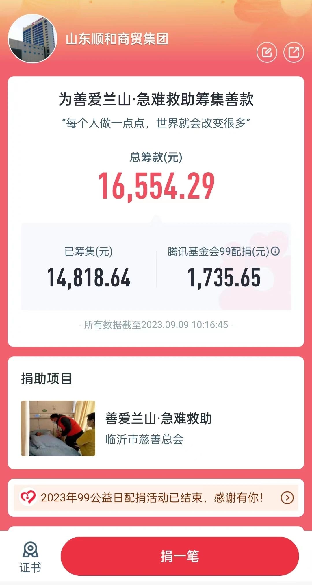為進一步弘揚慈善精神,傳播慈善理念,營造人人關(guān)心慈善事業(yè)、人人參與慈善事業(yè)的良好氛圍,9月7日—9日,山東順和集團開展為期3天的“慈心一日捐”暨“99公益日”活動。 本次活動按照“廣泛發(fā)動、鼓勵奉獻”的原則,通過騰訊網(wǎng)絡(luò)募捐方式進行,集團領(lǐng)導(dǎo)班子成員率先垂范,全體干部職工積極踴躍參與、奉獻愛心,截止至9日上午10時,本次“慈心一日捐”活動共籌集善款16547.39元,獲得騰訊基金配捐1728.75元,充分彰顯了順和人的慈善意識和責(zé)任擔(dān)當(dāng),用實際行動傳遞善行,營造了愛心互助、無私奉獻、樂善好施的濃厚氛圍。