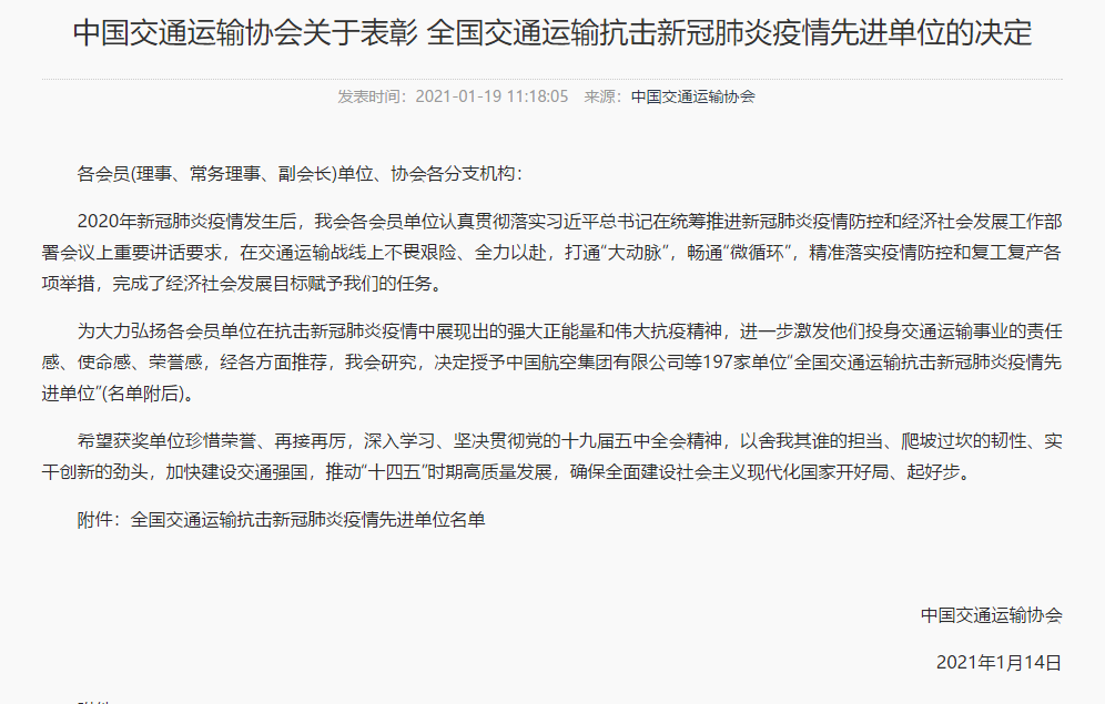 中國交通運輸協(xié)會關(guān)于表彰 全國交通運輸抗擊新冠肺炎疫情先進單位的決定
