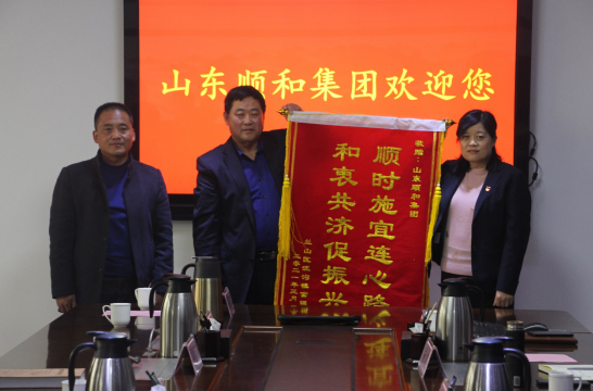 為感謝順和集團(tuán)向蘭山區(qū)汪溝鎮(zhèn)富強(qiáng)村捐款30萬(wàn)元用于修建道路,3月11日上午,蘭山區(qū)商務(wù)局局長(zhǎng)溫秀,蘭山區(qū)汪溝鎮(zhèn)人民政府鎮(zhèn)長(zhǎng)姜修偉,蘭山區(qū)汪溝鎮(zhèn)黨委副書記李明及商務(wù)局駐村第一書記,富強(qiáng)村代表等特意到山東順和集團(tuán)贈(zèng)送錦旗。集團(tuán)黨委書記、董事長(zhǎng)趙玉璽,黨委委員、副總經(jīng)理張磊,黨委委員、工會(huì)主席蘇效芹,集團(tuán)董事、順和物聯(lián)副總裁李邦等接待來(lái)訪。