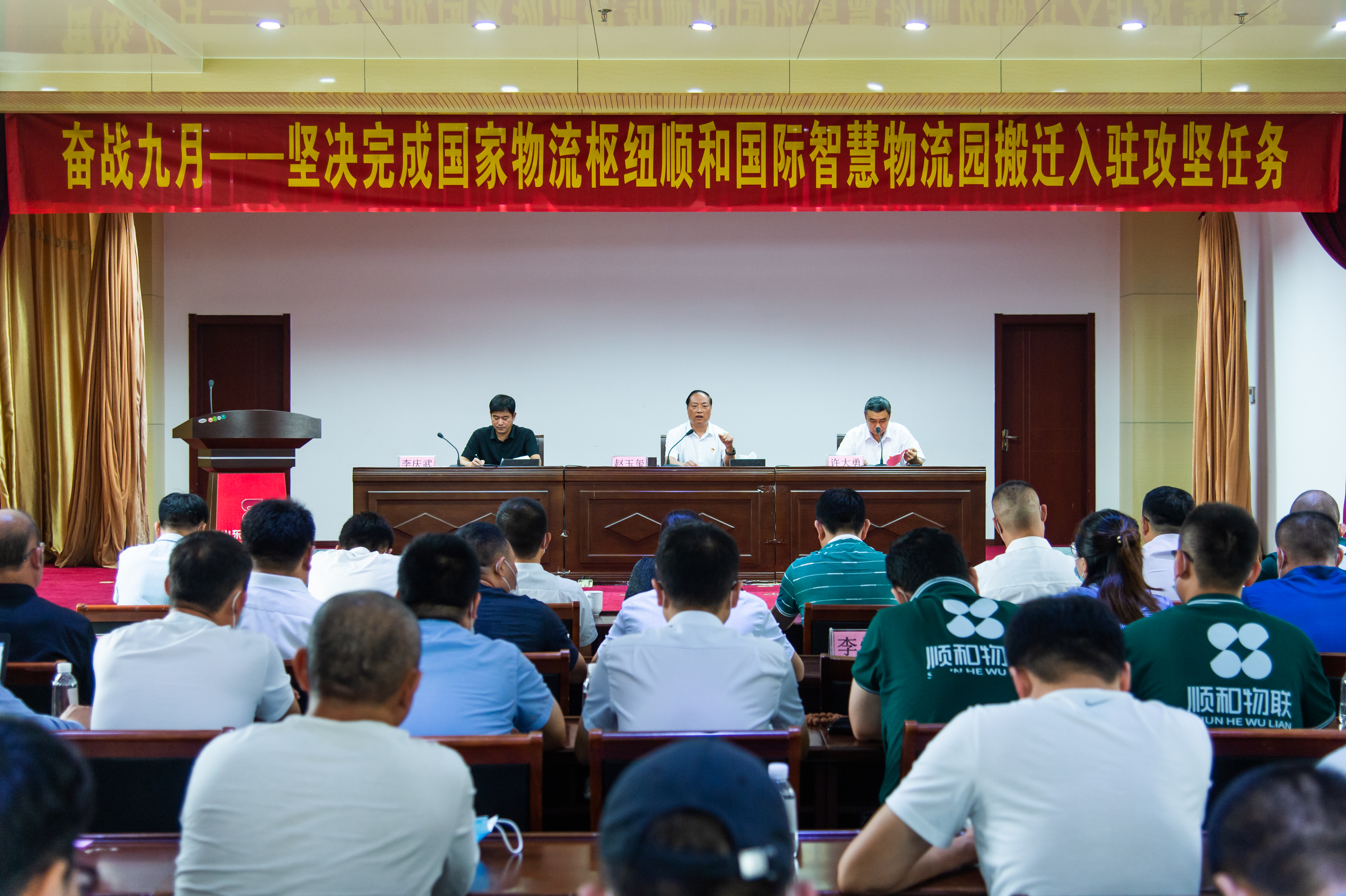 8月31日,山東順和集團(tuán)“奮戰(zhàn)九月—堅(jiān)決完成國(guó)家物流樞紐順和國(guó)際智慧物流園搬遷入駐攻堅(jiān)任務(wù)誓師大會(huì)”在集團(tuán)15樓會(huì)議中心舉行,集團(tuán)黨委書(shū)記、董事長(zhǎng)趙玉璽,集團(tuán)黨委、董事會(huì)成員,社區(qū)兩委成員,集團(tuán)、社區(qū)工作人員,順和物聯(lián)合伙人以及項(xiàng)目建設(shè)相關(guān)單位等參加大會(huì)。會(huì)議由集團(tuán)黨委副書(shū)記、總經(jīng)理許大勇主持。
